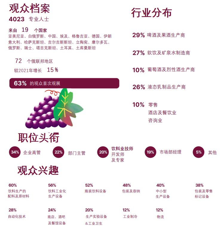 俄罗斯莫斯科饮料工业设备、配料及包装展览会(BeviTec)的独特之处在于它涵盖了饮料行业的整个技术链。广泛的商务活动包括酿酒活动、会议和酿酒大师班。每位参观者都将获得难忘的展览体验以及与专家的交流,了解饮料行业的当前趋势,并能够建立有利可图的合作伙伴关系。