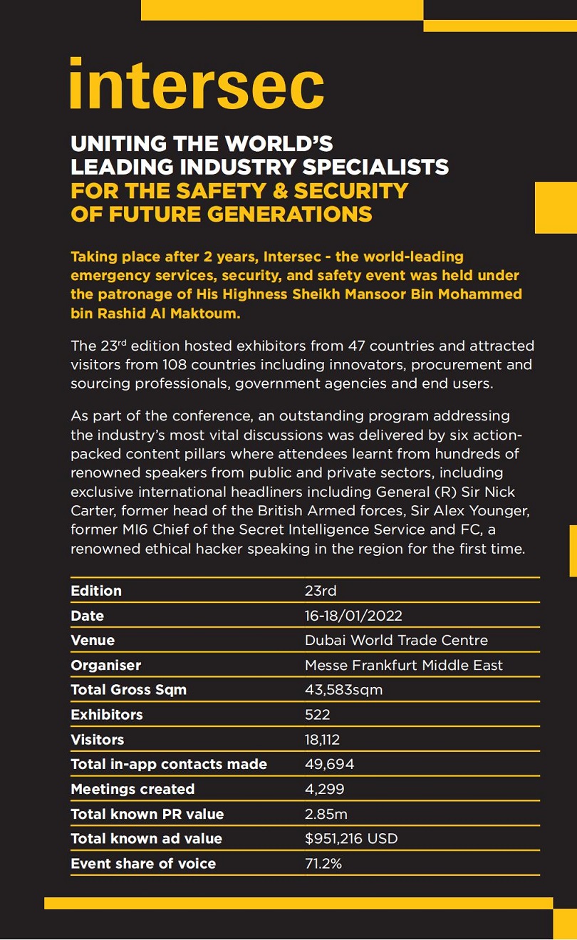 中东迪拜安防及消防展览会(Intersec DUBAI)将有超过1235家参展商分布在12个展厅,展示5个关键产品和服务组以及8个内容专题,涉及国土安全、网络和商业安全、安全与健康以及消防与救援。见证领先行业品牌的最新解决方案,与专家、政府官员和公司联系,探索安全领域的最新创新。