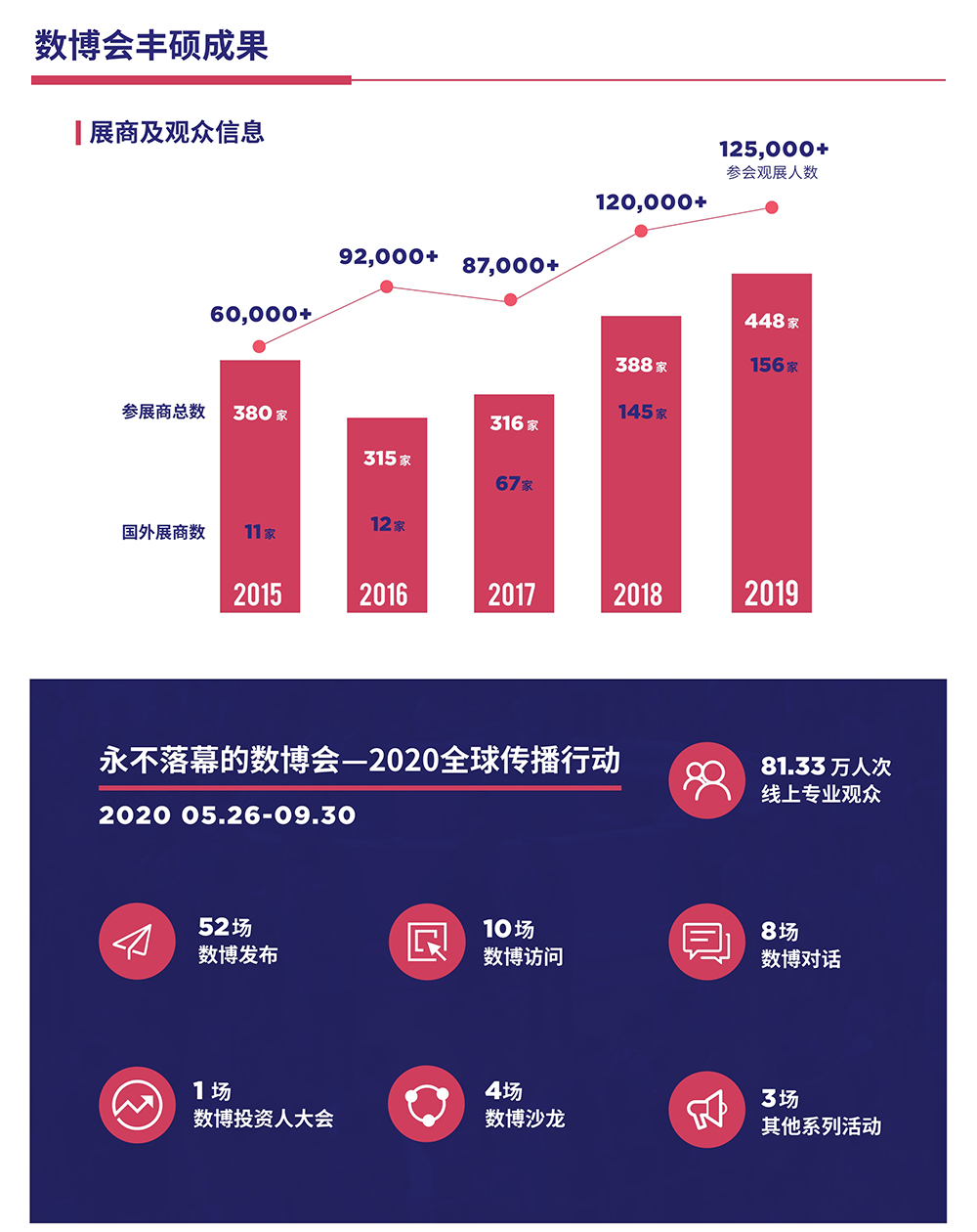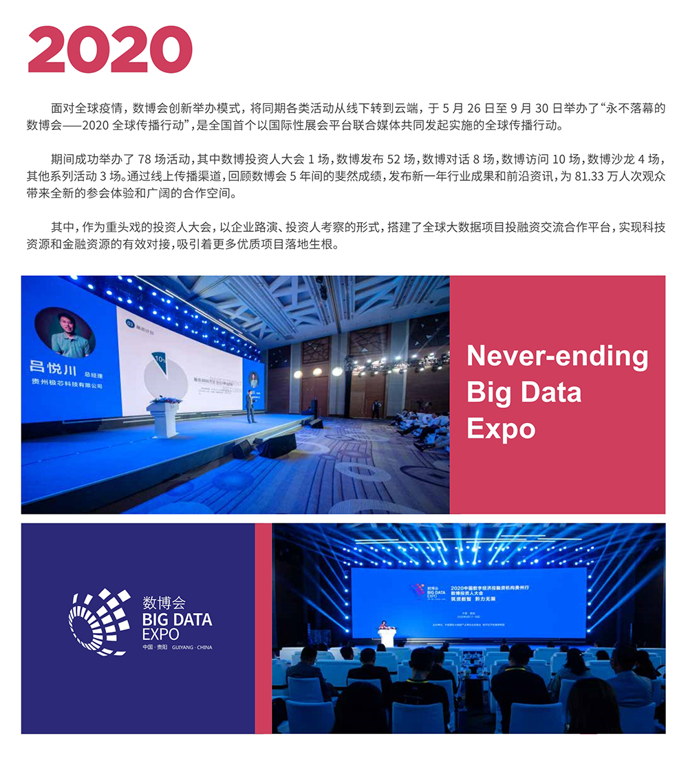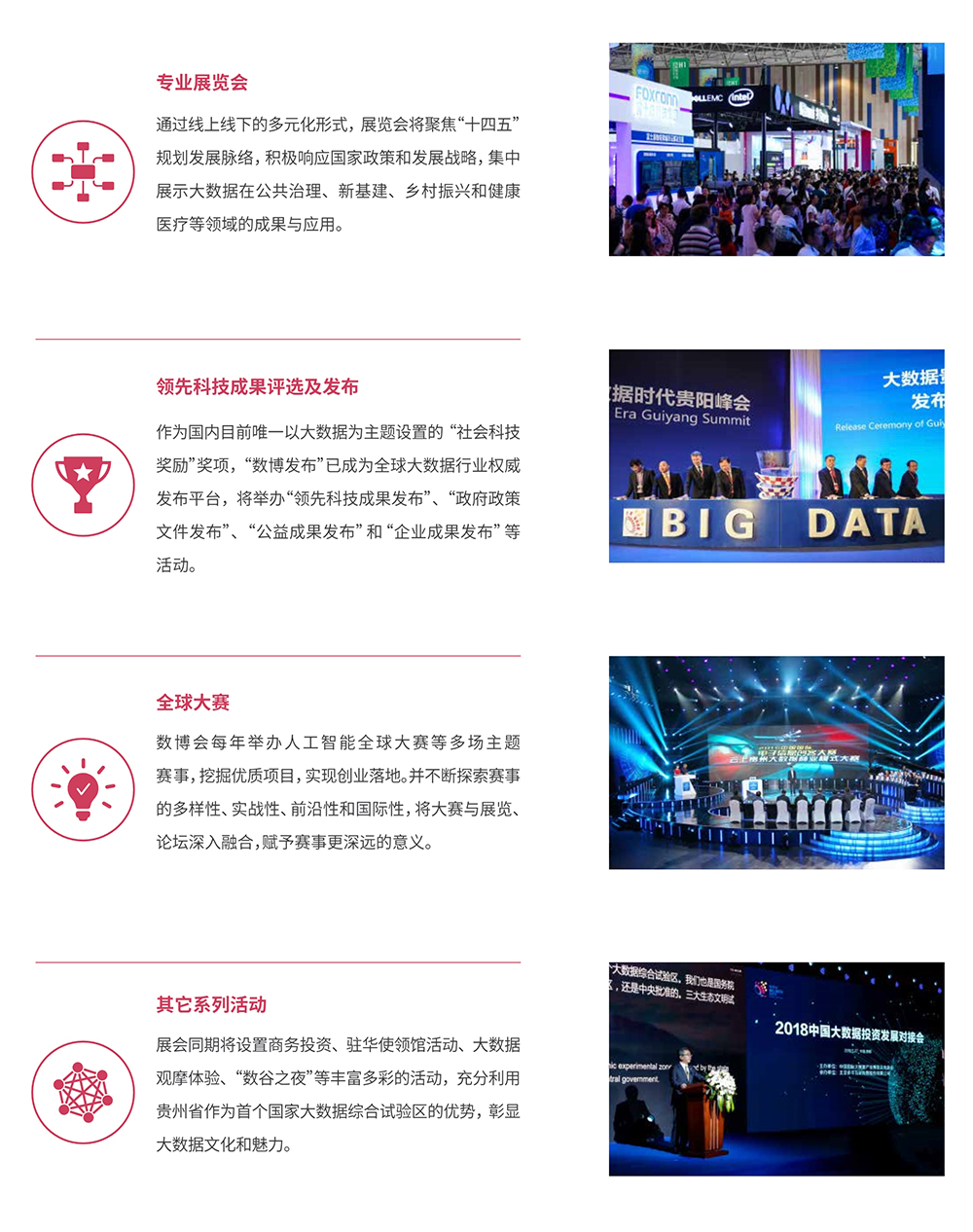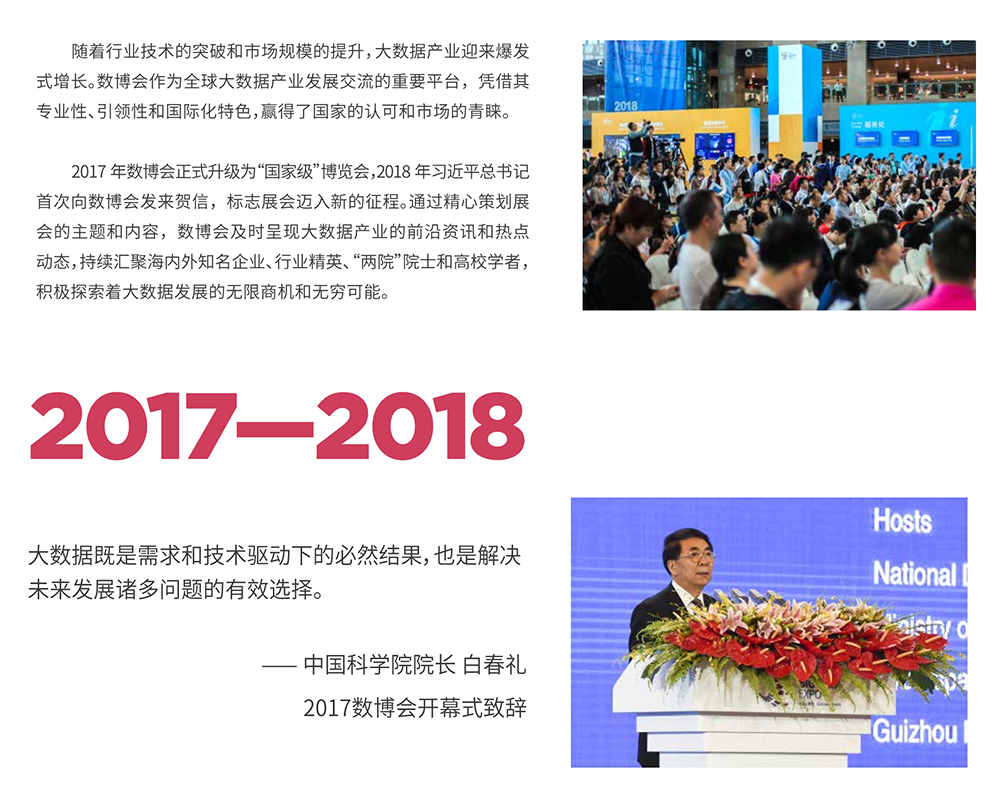 中国贵阳国际大数据产业博览会-数博会(BIG DATA EXPO)是全球首个以大数据为主题的国家级展会。由国家发改委、工信部、网信办和贵州省人民政府共同主办,现已成功充满合作机遇、引领行业发展的国际性盛会,成为共商发展大计、共用最新成果的世界级平台。数博会致力于研判大数据发展动态,聚焦行业热点痛点和难点,精心规划每届展会的主题和话题,同步呈现了全球大数据产业快速发展的完整历程。