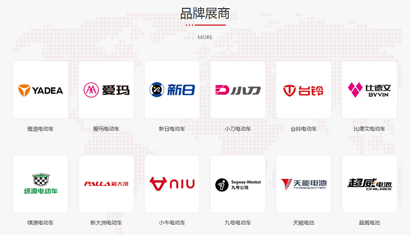 主要参展主要品牌有:新日、绿源、新大洲(派电)、萨博(五星黑马、杰宝大王)、格林豪泰、宝岛、大形小行、永久、凤凰、乐行(智迈)、雷迈、国威、豪晨、倍特、今日阳光、摩动青春、格士铃、飞鹤、正博、恩途、朗翔、俊超、鸿迅、骅利、立峰、宇锋、锋鸟、鸿尔达等两轮、三轮、低速四轮整车品牌。
