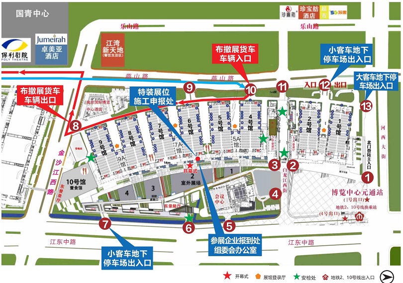 南京国际博览中心建筑面积36万平方米,其中展览面积17万平方米,总国际标准展位6000个,室外展览面积3万平方米,停车位2500个。会议中心包括5000平方米的多功能厅,800人报告厅,20间大小会议室,19间各式餐厅和一幢500间客房的4星级国际酒店。其他配套设施包括240间客房的经济型酒店,8200平方米办公服务设施等。