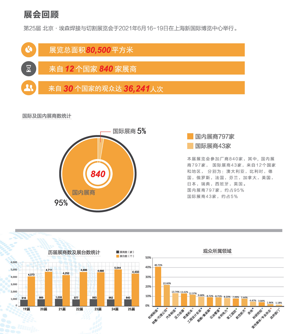 北京埃森焊接与切割展BEW上届展会总面积41991平方米,参展企业993家,其中国际展商117家,参展人数达33849人。BEW观众主要来自机械制造、压力容器、汽车制造、铁道机车、石油管道、船舶、航空航天等行业。国内外专业杂志、相关展览会、互联网等100多家媒体多渠道全方位对展会进行宣传报道。