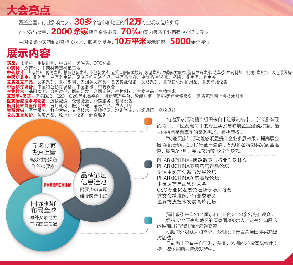 广州药交会-全国药交会(PHARMCHINA)本届展会展出产品涵盖化学药、中成药、中药饮片、配方颗粒、OTC药品、医用耗材、医疗器械、中医诊疗及中医药设备、个人护理用品、成人用品、医美融合产品、医药研发供应链、医药物流技术与设备、互联网+医药、智慧营销等细分产业集群,"专区专展"的展出模式极大程度地凝聚目标观众。