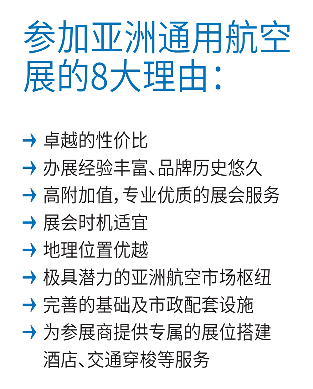 珠海亚洲通用航空展(AERO ASIA)的定位非常明确:凝聚通用航空产业力量,发展壮大市场,以最先进的技术和最新的专业知识为企业创造价值,打造中国乃至亚洲最具影响力的通用航空展示品牌。