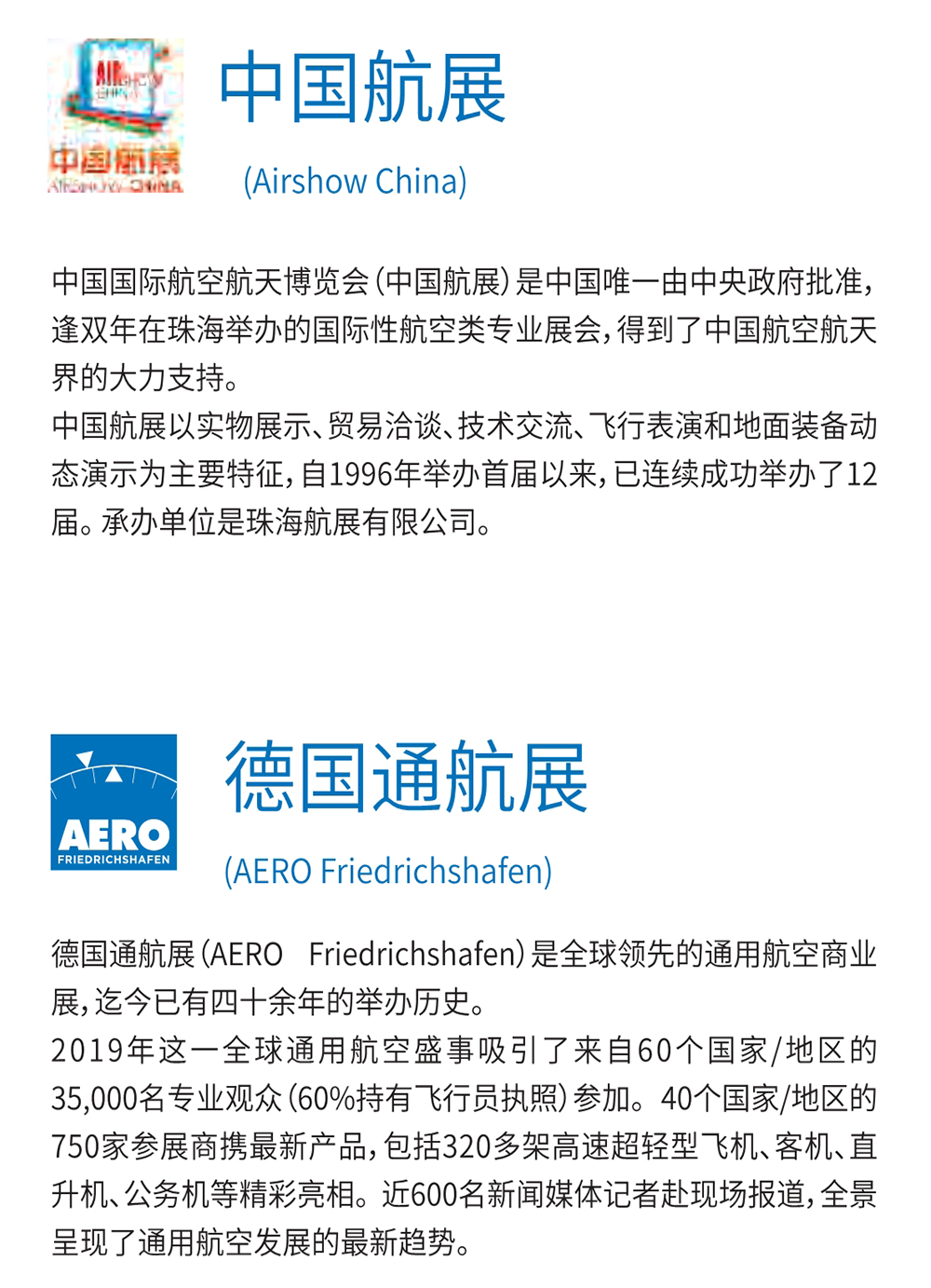 珠海亚洲通用航空展(AERO ASIA)由世界两大知名航展—德国通航展(AERO)、中国航展(Airshow China)携手主办,致力于成为中国乃至亚洲领先的商务及通用航空展。在德国腓特烈斯哈芬市举办的德国通航展(AERO)是全球领先的通用航空商业展。中国航展自1996年起已跻身全球五大航展之列,是中国规模最大、最具国际影响力的综合性专业航展。