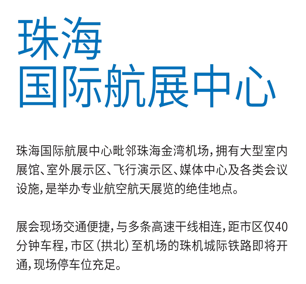 珠海国际航展中心建于1996年,位于广东省珠海市金湾区三灶镇机场路,占地面积88万平方米,拥有航空航天馆(1-7号)、兵器馆(8号)、9-11号馆固定展馆及新闻中心、贵宾房、室外展区、地面装备动态演示区、商业区及停车场等设施。