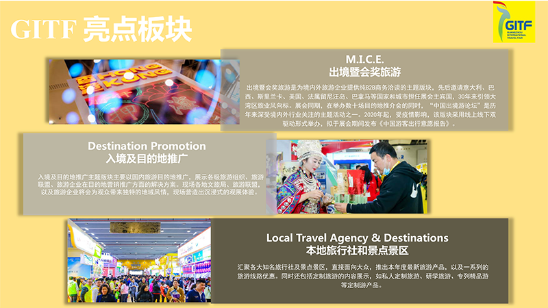 广州国际旅游展览会(GITF)密切关注行业、市场和潮流的发展趋势。今年展会创新推出体现“未来文旅”发展方向的热点板块,包括汽车文化旅游主题活动专区、研学游学展区、湾区文创IP馆和GITF网络直播节。另外,数动文旅专区、非遗专区、民宿专区和湾区创意文体旅专区将全面展示各具特色的旅游产品及服务。这些“专精特新”板块合力将广州国际旅游展打造成为展示国际旅游新潮流的高水准平台。