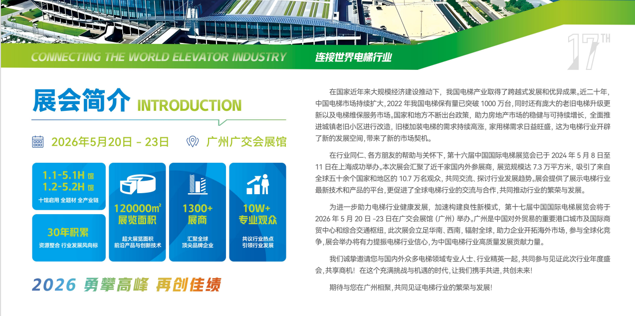 中国国际电梯展览会(WEE EXPO)是世界电梯行业重要的盛会之一,旨在为全球电梯制造商、供应商与客户提供一个共同交流的平台,展示最新技术和产品。届时,您将有机会结识各类来自不同国家和地区的专业人士,并深入了解行业发展趋势,掌握最新技术应用。