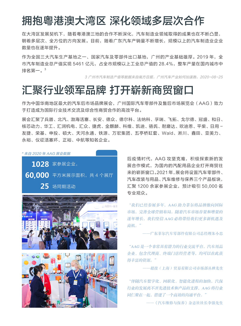 广州国际汽车零部件及售后市场展-广州汽配展(AAG)是华南地区规模最大的汽车零配件、用品及改装、维修保养及检测诊断设备展览会。作为广州市重点培育的品牌展会,深耕华南市场多年,在广州区域经济整合将进入新阶段的同时,分享新一轮的改革开放的红利。积累与持续发力,AAG的影响力逐年提升,已经成为华南区域极具认可度的会展品牌。