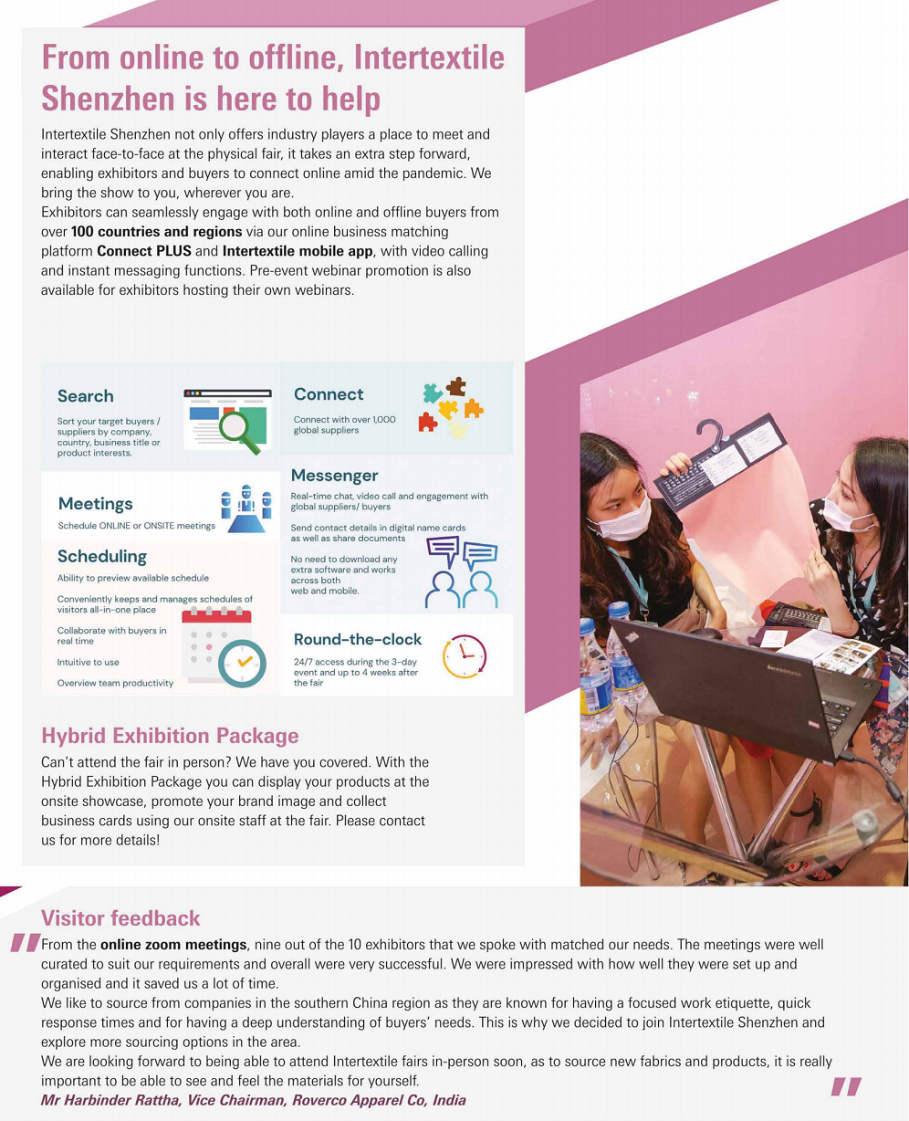 凭借令人难以置信的各种面料、纤维设计、创新技术和广泛的服务,深圳展会的机会是无穷无尽的。深圳国际纺织面料及辅料展览会(Intertextile Shenzhen)除了各种各样的产品和服务之外,由于来自中国和世界其他地区的服装制造商、设计师和供应商将出席,因此在商业前景方面将有丰富的可能性。