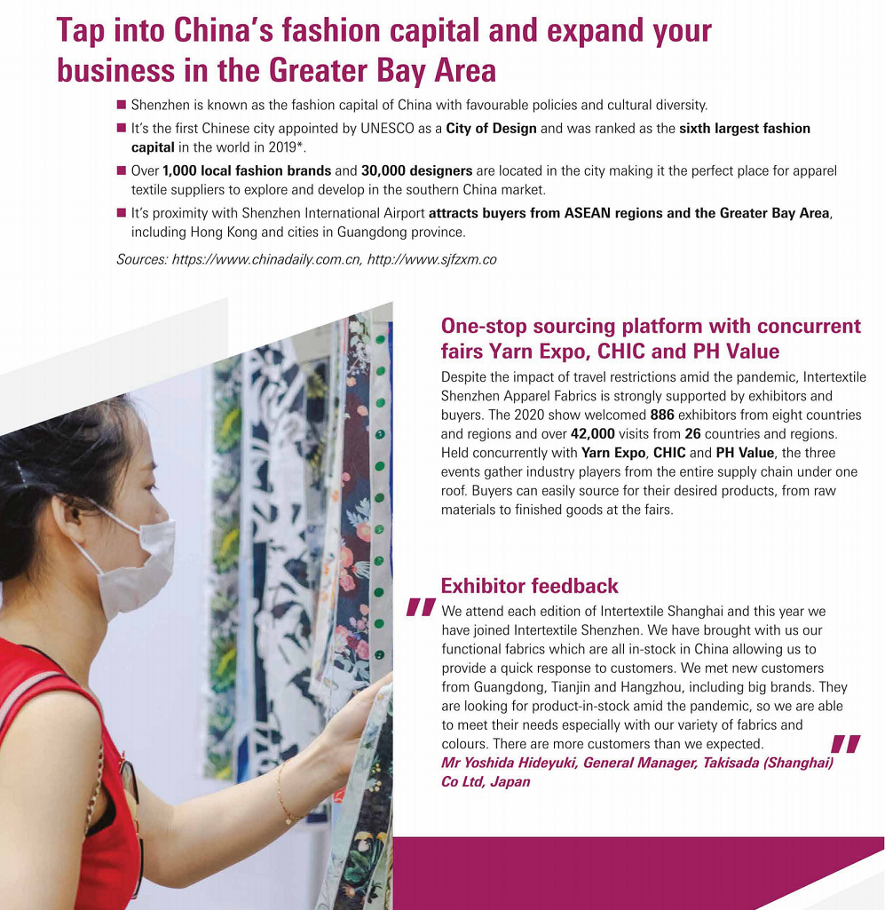 深圳国际纺织面料及辅料展览会(Intertextile Shenzhen)您可以与行业内的专家和领军人物亲密接触。各种面料的制造商和供应商、买家、公司决策者以及中国时尚界有影响力的成员将出席此次纺织品贸易展,提供理想的商业机会。