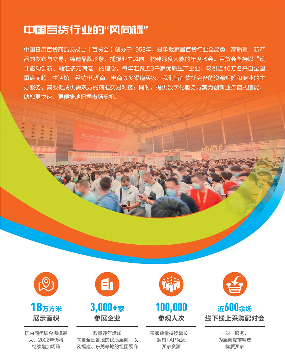 中国日用百货商品交易会(简称:上海百货会)是亚洲范围内历史悠久的家居用品行业旗舰展会。经过多年积淀与不断创新,百货会一直以来就是倍受业界信任的家庭用品专业交易和合作交流平台。