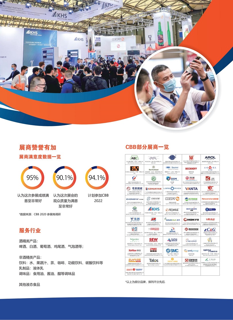 上海国际酒饮料制造技术及设备展览会(CBB)是全球瞩目的亚太地区液体食品加工及包装领域规模最大、水平最高、专业性最强、最具权威和风向标意义的品牌展会。为业界演绎涵盖酒、饮料、液体乳、液体调味品等行业的原辅料、工艺、包装、贮存、运输等全产业链。