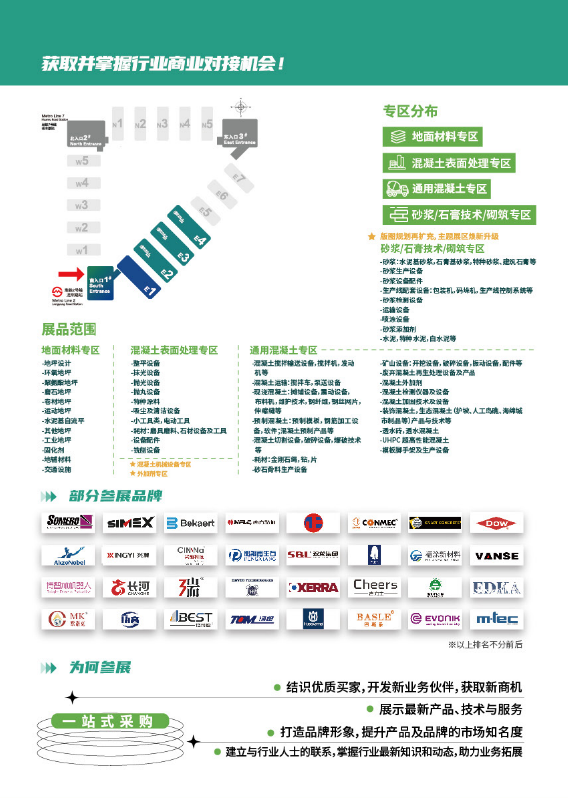 作为全球混凝土、砂浆、地坪行业了解中国及亚太市场需求、洞察行业趋势的重要窗口!上海亚洲混凝土展览会(World of Concrete Asia)国际展商回归势如破竹,汇集诸多国际展商品牌,抓住巨大商机,展示品牌实力。此外,更有山东万世、林德洛克、秋田机械、山东华昂、百力得机械、青岛环港重工、吉力士、河北紫辰、上海正欧、富世华、山东乐威、河南尚美亿博等全产业链千余家展商及品牌携上万款新品亮相。