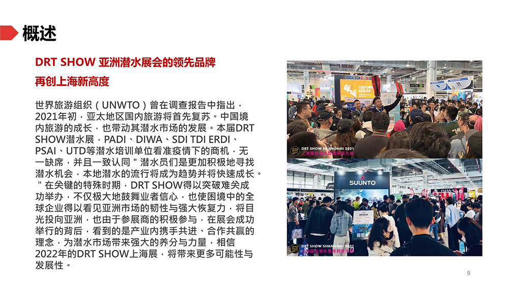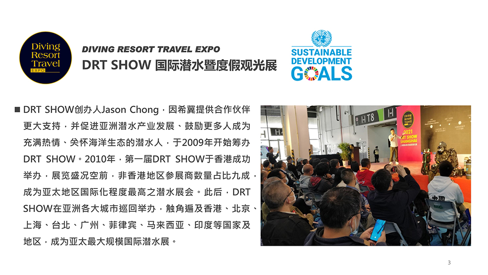 上海国际潜水及度假观光展(DRT SHOW)是亚太地区最大的专业B2B/B2C潜水暨度假观光展。提供所有最新、最专业、最丰富的潜水行业知识。每年服务超过2500个展位,亦吸引来自全球65个国家及地区超过45万名专业买家及访客参与。