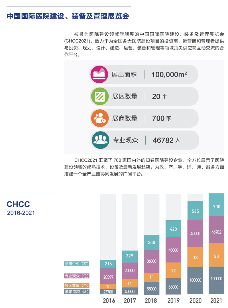 全国医院建设大会(CHCC)同期重磅品牌活动中国国际医院建设、装备及管理展览会CHCC打造亚洲第一大医院建设大展。自推出起,紧贴国内外医院建设市场发展与创新应用,将各种新技术、新设备、新方案同台共享,旨在构建一个产业广泛覆盖、学术深度研发的“双引擎”品牌大战略平台。