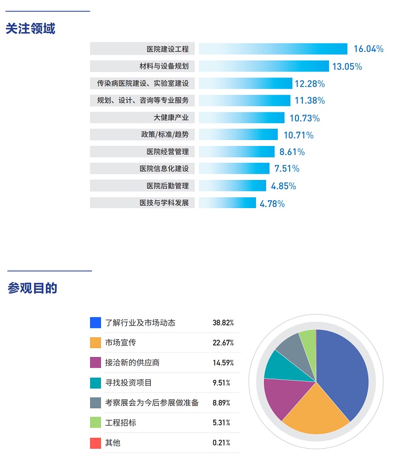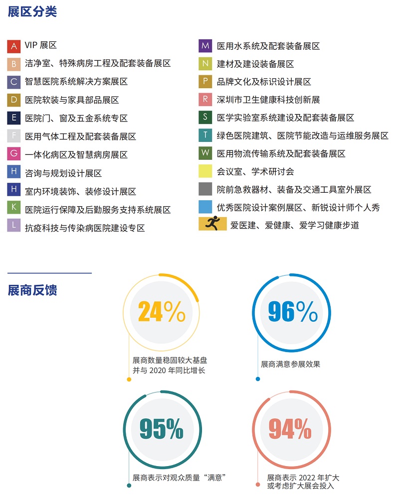 智慧医院与服务创新板块:医院运行保障及后勤服务支持系统展区;智慧医院系统解决方案展区;医疗健康服务机构展区;工程总包及专项工程材料设施创新综合展区;洁净室、特殊病房工程及配套装备展区;医疗产业园区展区;智慧医疗产业服务平台展区;康养机构工程建设展区