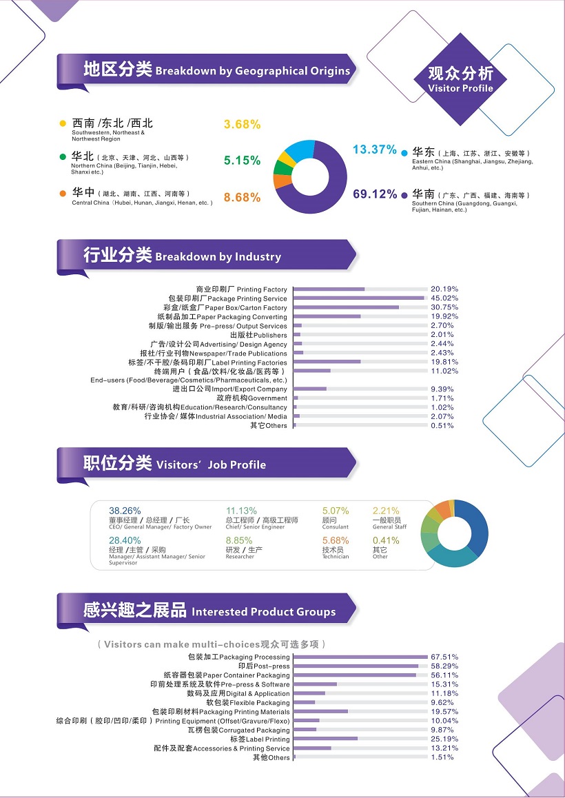 本次展览覆盖印刷、标签、包装、包装制品全产业链,从标签印刷设备及材料、包装印刷及印后设备,到包装设备及解决方案、包装材料及制品等。为包装印刷厂、彩盒厂、标签厂、软包厂、纸制品加工厂、电子标签厂、商业/设计服务、食品/饮料/日化/医药/化妆品/电子电器等终端产品制造商、电商物流、进出口/贸易商等企业寻求具有成本效益和稳定可靠的生产解决方案提供了专业高效的交流平台。