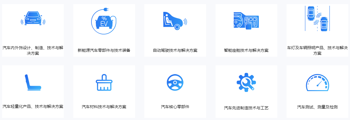汽车内饰与外饰;新能源汽车技术;自动驾驶技术与软硬件;智能座舱与车联网技术;先进制造技术及装备;汽车材料与轻量化技术;车用空调及热管理系统;汽车电子电器展区;汽车线束与连接器;汽车测试与质量监控;汽车核心零部件;汽车配件及配套产品