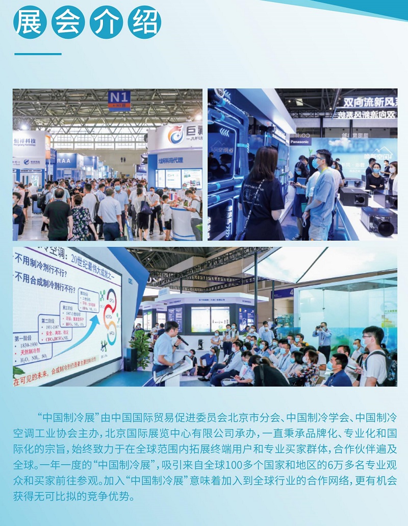 中国制冷展(CR EXPO)是世界领先的制冷、空调、采暖和通风、冷冻食品加工、包装和储存展览会之一。由中国国际贸易促进委员会北京市分会、中国制冷学会、中国制冷空调工业协会、上海市制冷学会及上海冷冻空调行业协会共同主办。拥有国际展览业协会(UFI)和美国商务部(USFCS)两项权威国际认证,作为全球该专业领域内规模最大的专业展会之一的中国制冷展,形成了以展览展示为龙头,以高端论坛为支撑、以互联网为载体的多元化平台。
