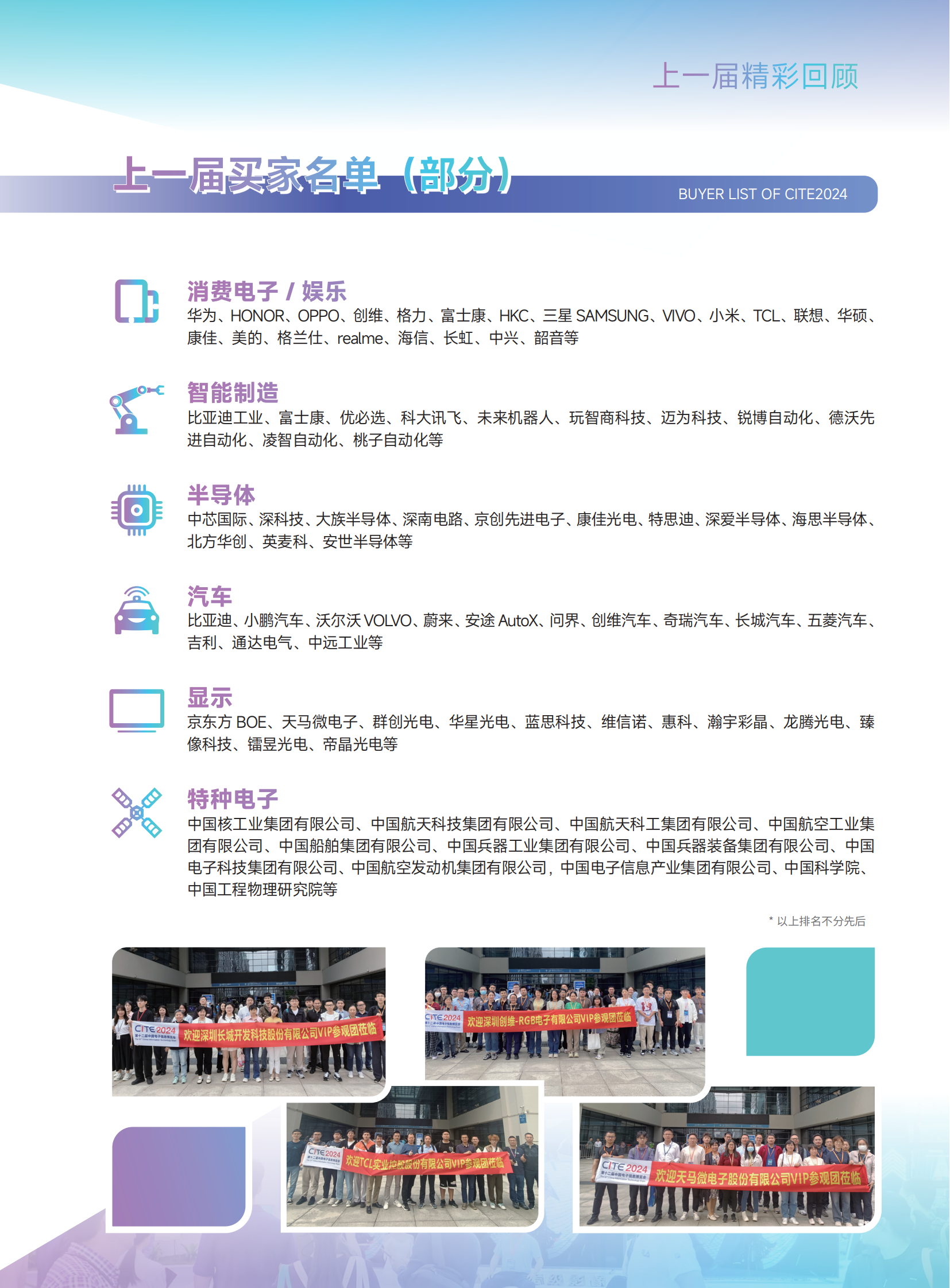 中国深圳电子信息博览会(CITE)展会面积达10万平米,预计吸引1500+展商和8万+专业观众。博览会设置了9大展馆、超30个主题展区,涵盖智能终端、智慧家庭、人工智能、数据基础、低空经济、新型能源、电子元器件、特种电子等八大专业领域。