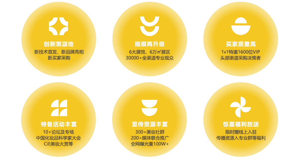 所有美妆产品,包含但不限于新锐国货、创新品牌、功效护肤、香氛潮品、家清生活、欧美日韩进口品、OEM/ODM/OBM、创新包材、特色原料、检测、膜布、MCN机构、电商及营销平台、数据机构、设计公司、备案机构等