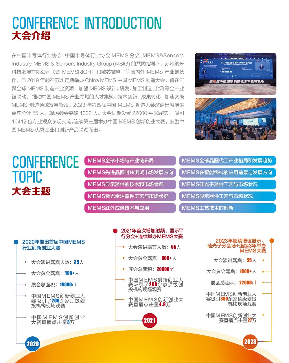 在中国半导体行业协会和中国半导体行业协会MEMS分会的共同指导下,联合MEMSRIGHT和敏芯微电子等国内外MEMS企业、科研机构、投资平台等,在苏州定期举办China MEMS中国MEMS制造大会,旨在汇聚全球MEMS制造产业资源,加强MEMS设计、研发、加工制造、封测等全产业链联动,推动中国MEMS产业领域的人才集聚、技术创新、成果转化,加速突破MEMS制造领域发展瓶颈。