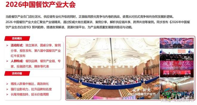 核心主题:竞争合作·共同发展核心目标:打造一个集“新品发布、资源整合、趋势研判”于一体的餐饮全产业链平台,成为连接品牌商、供应商、服务商与投资方的关键纽带,为规模达6.8万亿元的中国餐饮产业激发新动能。三、展示内容与特色