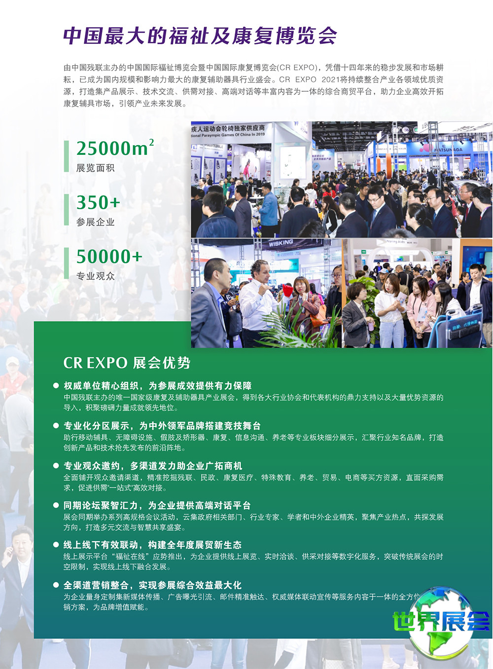 北京国际福祉及康复展-中国福祉博览会(CR EXPO)是我国唯一一个由国家部委层面主办的残疾人辅助器具博览会。该展会由中国残疾人联合会牵头举办,现已发展成为国内覆盖面最广、专业度最高、国际参与度最深的辅助器具专项展览。
