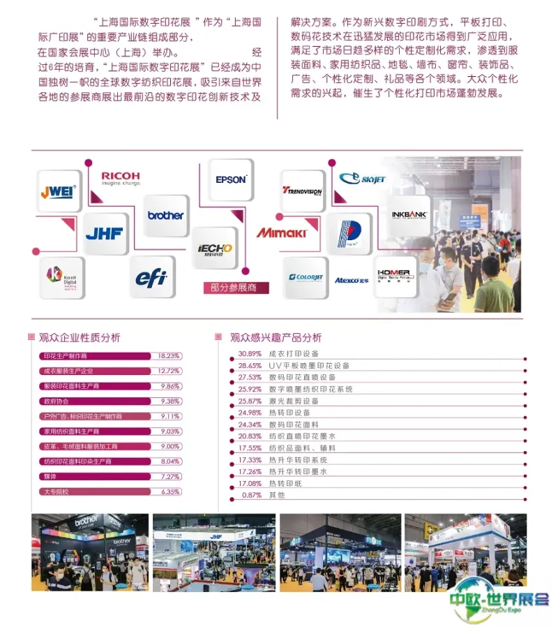 上海国际数字印花展览会(DIGITAL TEXTILE PRINTING EXPO)是全球享有盛誉的数字印花展览会。同期举办的上海国际广印展览会。邀请更多中外一流数字印花工业品牌厂商参展。