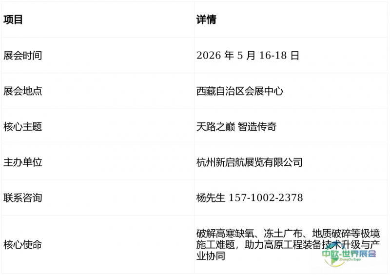(2026中国高原工程建设博览会及工程机械、建材机械、工程车辆、矿山机械与隧道桥梁技术装备展览会),以“天路之巅 智造传奇”为核心主题,定于2026年5月16日至18日在西藏自治区会展中心举行。展会致力于聚焦高原极端环境下的工程装备与技术,深入对接川藏铁路等国家级重大工程项目,为“一带一路”倡议及南亚贸易通道建设提供助力。以下为简要介绍: