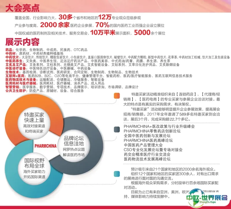 广州药交会-全国药交会(PHARMCHINA)本届展会展出产品涵盖化学药、中成药、中药饮片、配方颗粒、OTC药品、医用耗材、医疗器械、中医诊疗及中医药设备、个人护理用品、成人用品、医美融合产品、医药研发供应链、医药物流技术与设备、互联网+医药、智慧营销等细分产业集群,"专区专展"的展出模式极大程度地凝聚目标观众。
