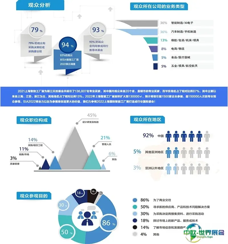 2022第二十届上海国际工业自动化及机器人展览会(SIA)在2022年6月29-7月2日在国家会展中心(上海)举行。展会涵盖了工业自动化、工业装配、工业传输、工业机器人、机器视觉、3D电子等领域。同期举办”2022上海国际智能工厂展览会“直接并全面服务于智能制造行业从源头到终端的整条产业链。上届展会参展企业1200家,专业观众110000人次。基于上届展会取得圆满,众多参展商纷纷扩大参展面积,因此本届展会面积扩大到130000平方米,预计将吸引超1300家企业参展、超100000人次的专业观众参观。SIA-2022将全力以赴为参展商创造更大的价值,我们力争将2022上海国际智能工厂展打造成行业国际盛会!
