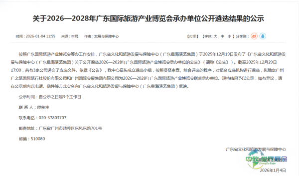 依据展会筹备工作的整体部署,经过广东省文化和旅游发展与保障中心(广东星海演艺集团)公开征集、资质审核与综合评定,现正式宣布:广州广之旅国际旅行社股份有限公司与广州国际会展集团有限公司成为2026至2028年广东国际旅游产业博览会的联合承办方。