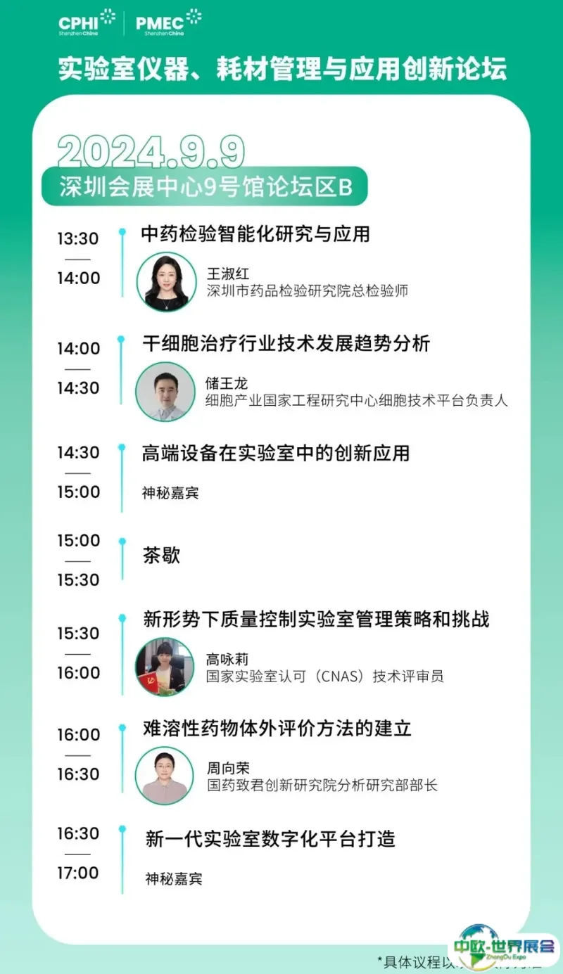 9月9日,展会主办方上海博华国际展览有限公司将携手动脉网推出《实验室仪器、耗材管理与应用创新论坛》。届时,来自国家药典委员会、深圳市药品检验研究院的权威专家以及实验室仪器、耗材及试剂的上下游产业链的企业代表也将亲临现场,分享实验室管理规范、仪器与耗材国家相关法规、药物研发过程中的困境和挑战及高端设备与耗材的前沿应用等重点话题。