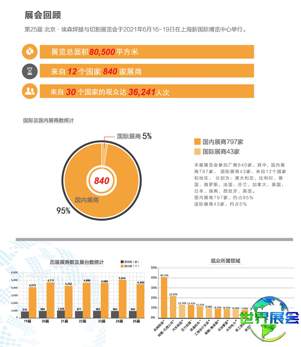 上届北京埃森焊接与切割展BEW的总展览面积达到41991平方米,汇聚了993家参展企业,其中包括117家国际展商,参展人数高达33849人。BEW的观众主要来源于机械制造、压力容器、汽车制造、铁道机车、石油管道、船舶、航空航天等行业。国内外超过100家专业杂志、相关展会及互联网媒体通过多种渠道对展会进行了全方位的宣传报道。