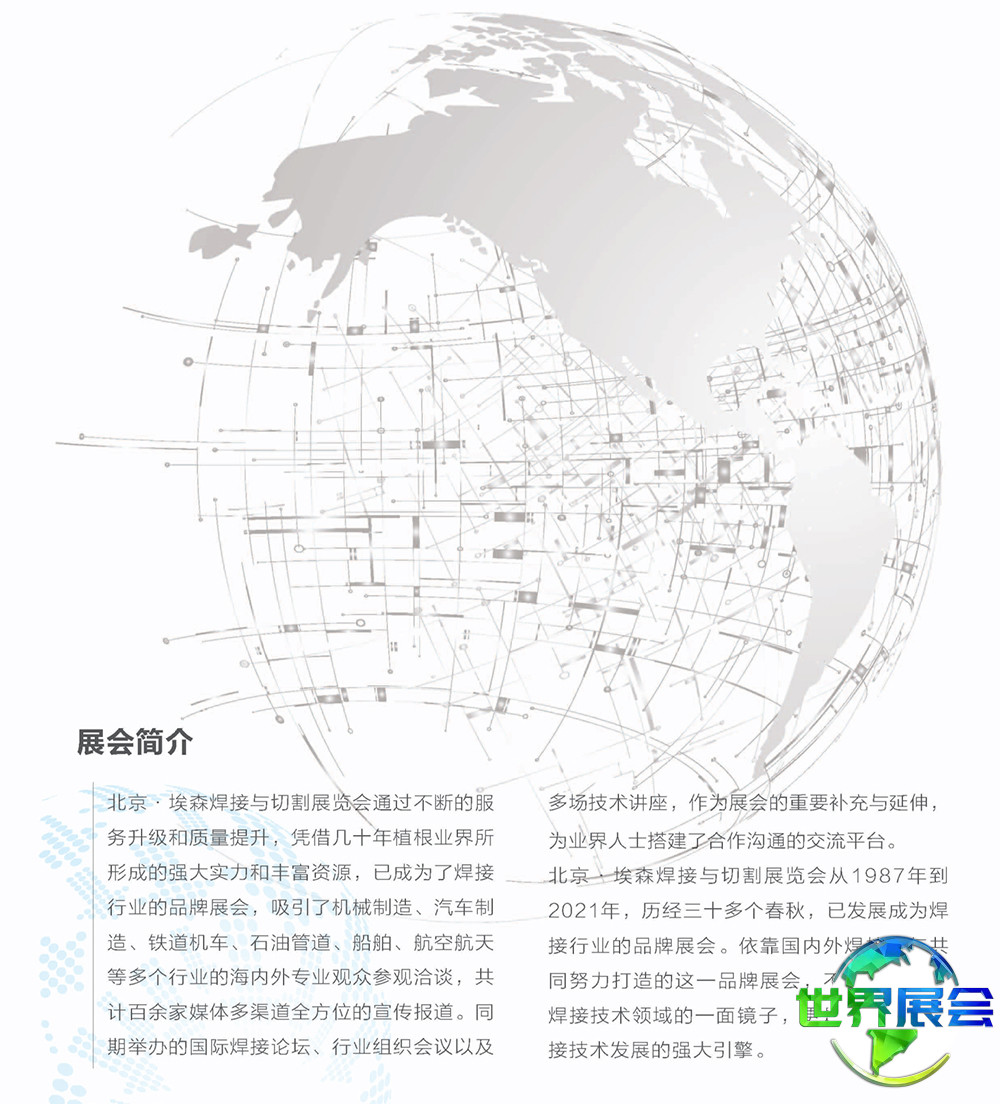 中欧世界展会网是一个提供全球展会门票购买、展位申请、设计搭建服务的综合性平台,为您提供北京埃森焊接展的展位预订服务。