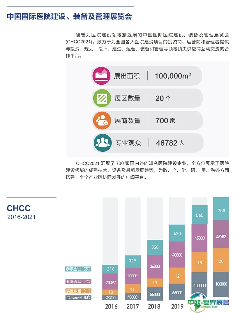 全国医院建设大会(CHCC)同期重磅品牌活动中国国际医院建设、装备及管理展览会CHCC打造亚洲第一大医院建设大展。自推出起,紧贴国内外医院建设市场发展与创新应用,将各种新技术、新设备、新方案同台共享,旨在构建一个产业广泛覆盖、学术深度研发的“双引擎”品牌大战略平台。