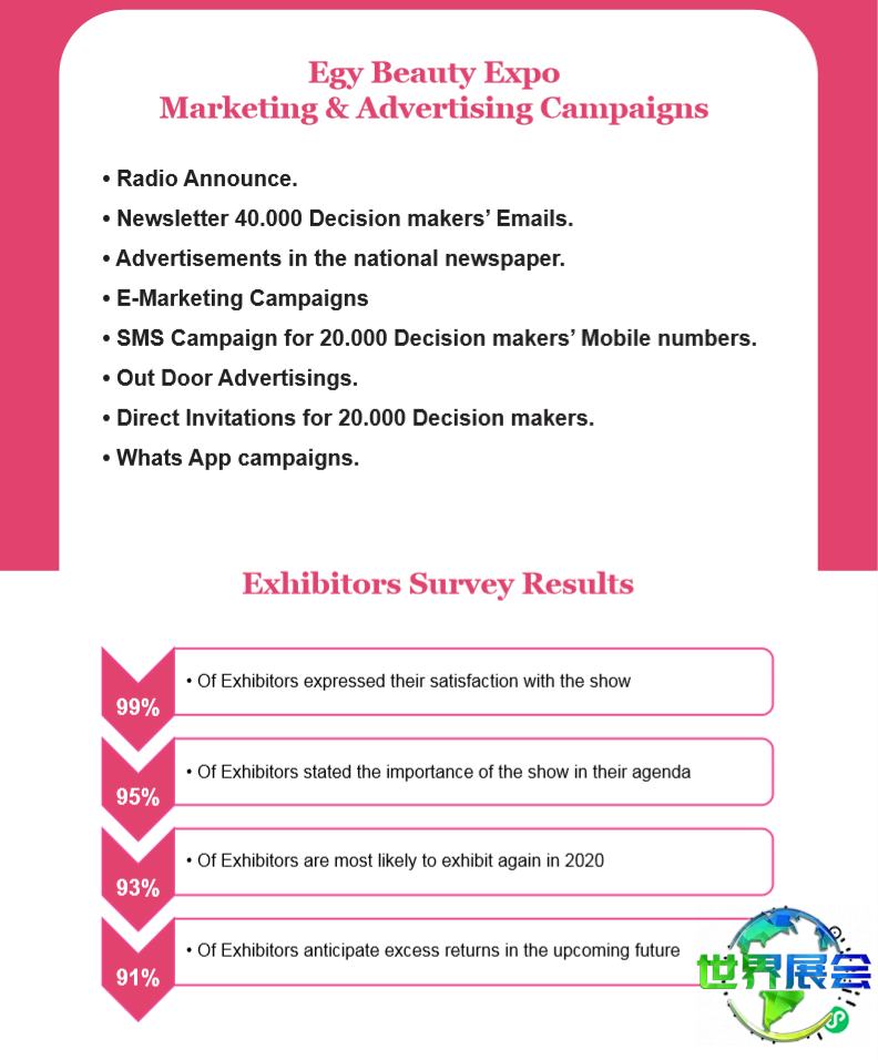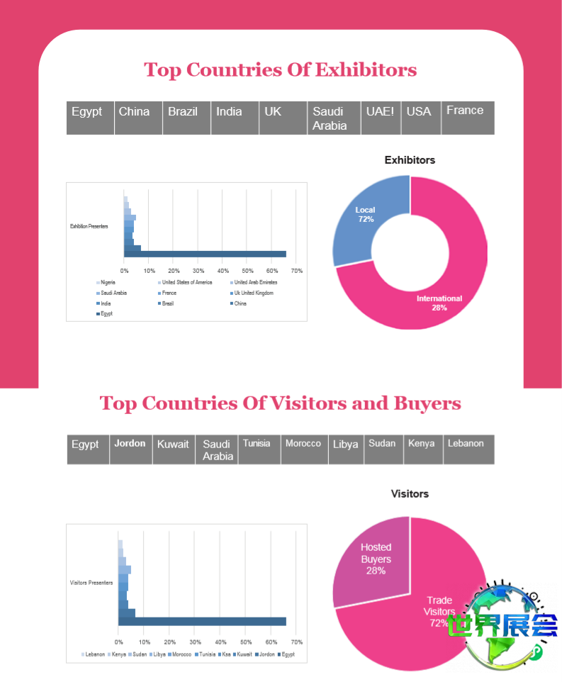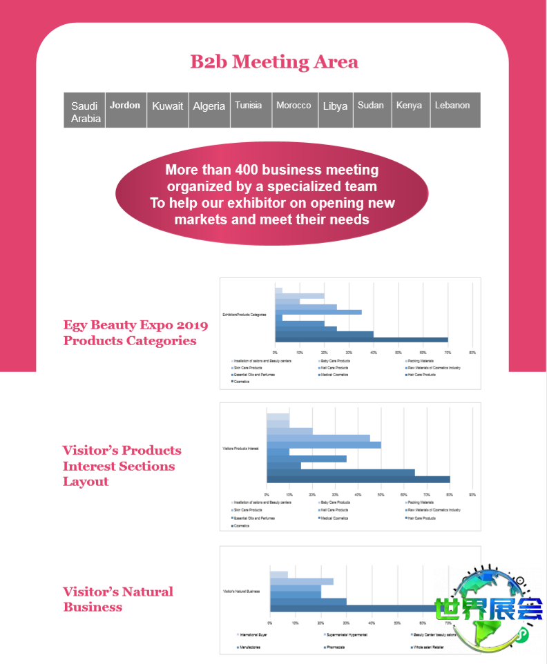 作为一个专业的B2B展会,采购商涵盖北非及全球各地的买家。埃及美容及化妆品展——非洲美容展(Egy Beauty Africa)作为首个汇聚西非与北非市场美容行业专家与决策者的盛会,其配套活动包括由美容与美容专业人士主持的研讨会,以及参展商展示的新产品与新技术。
