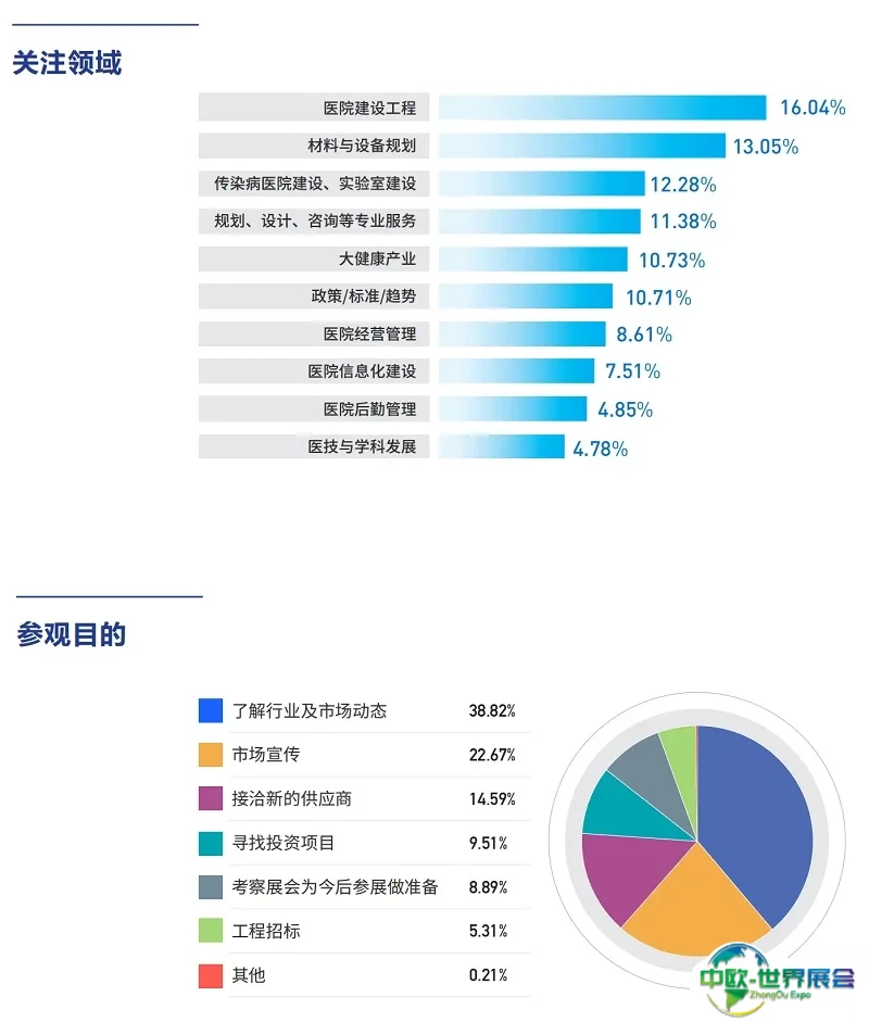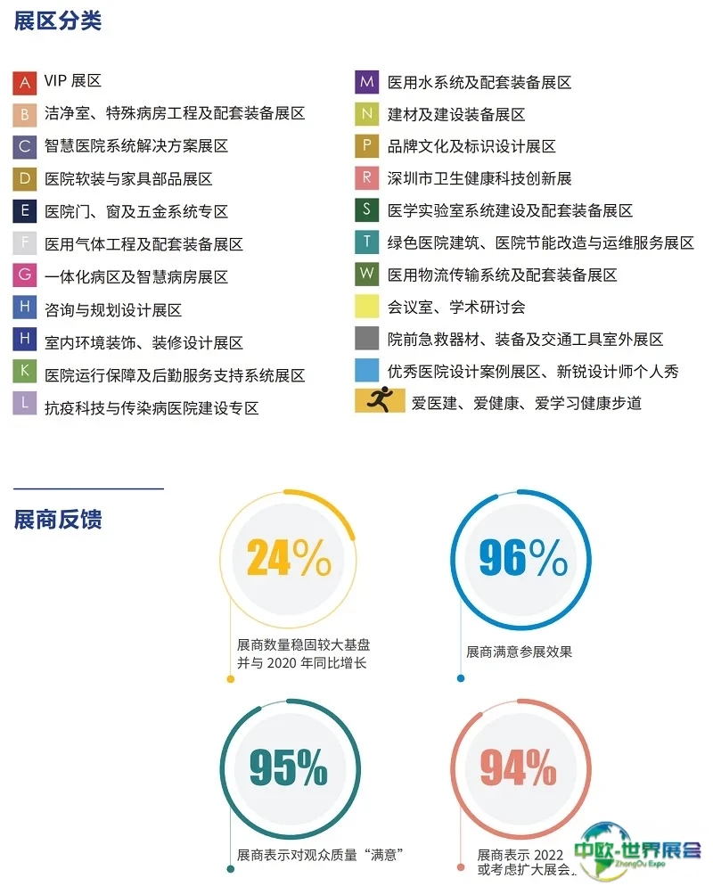 医疗专项工程与科技创新版块:洁净室、特殊病房工程及配套装备展区;医用气体工程及配套装备展区;实验室工程及装备展区;医院物流传输系统及配套装备展区;环境工程与设备设施展区;绿色医院建筑 \ 医院节能改造与运维服务展区;医院用水系统及配套装备展区