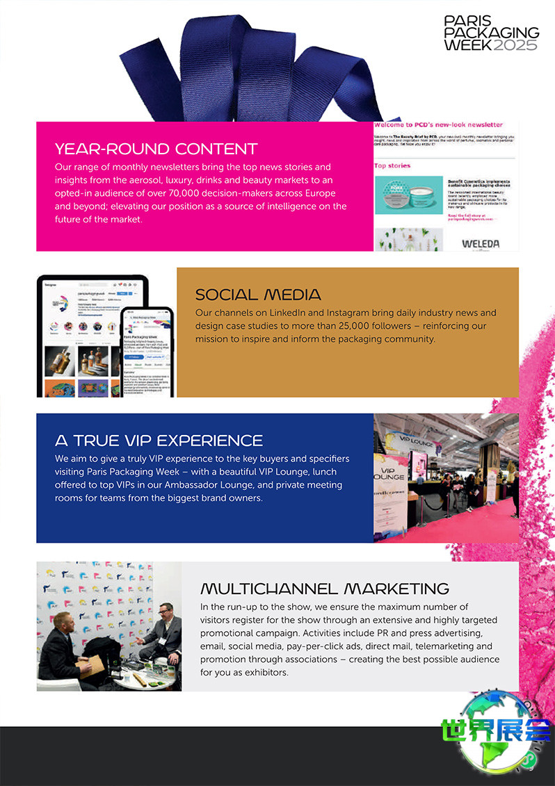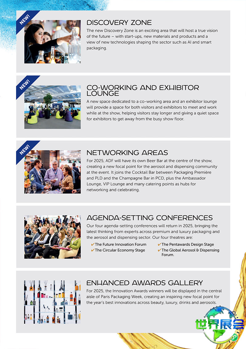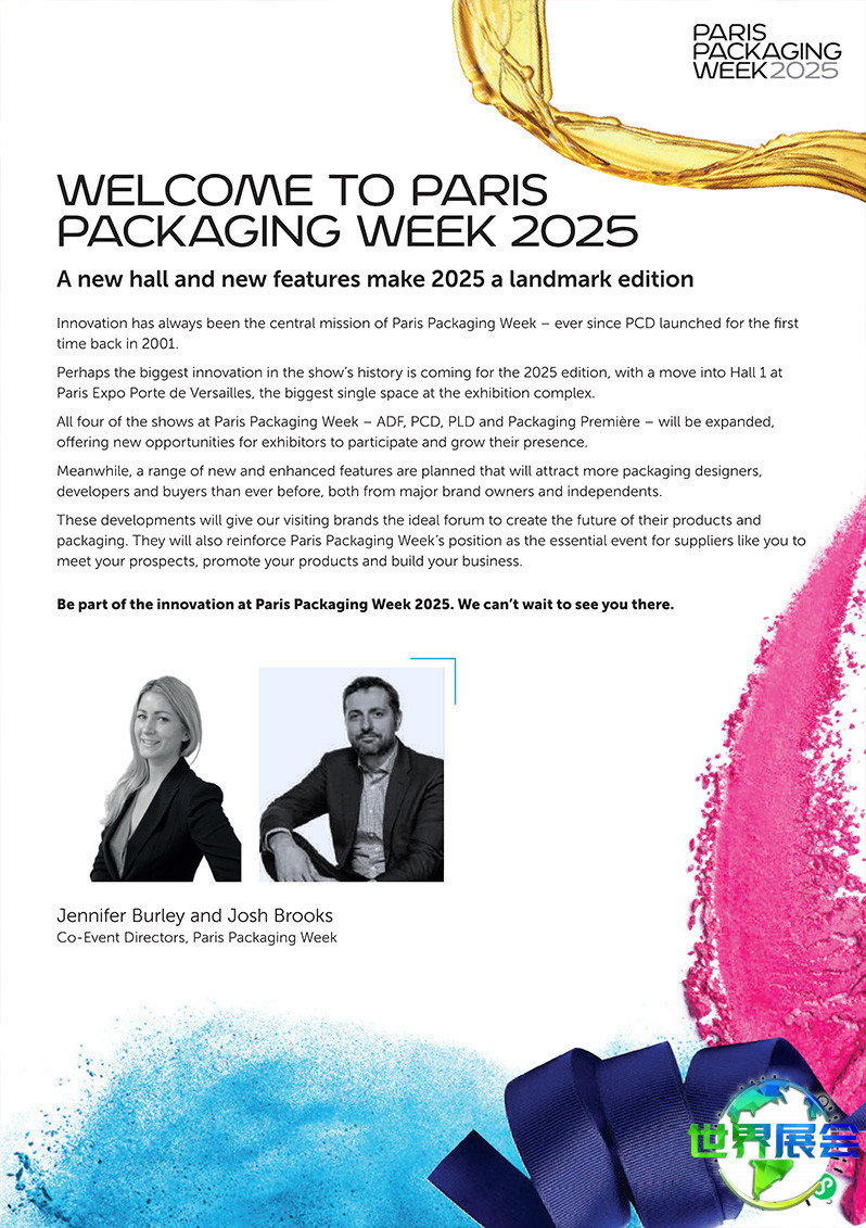 巴黎包装周是一个荣获多项大奖的包装行业节日,内容覆盖美容个护、高端饮品、气雾剂及奢侈品领域。法国巴黎化妆品、香水包装及奢侈品包装展览会(Paris Packaging Week)旗下的四大展览——ADF、PCD、PLD和Packaging Premiere,助力数以千计的品牌筹划其新品发布。通过将参与者与前沿创新成果、全球顶尖供应商以及关于设计、可持续性与创新的权威见解相连接。