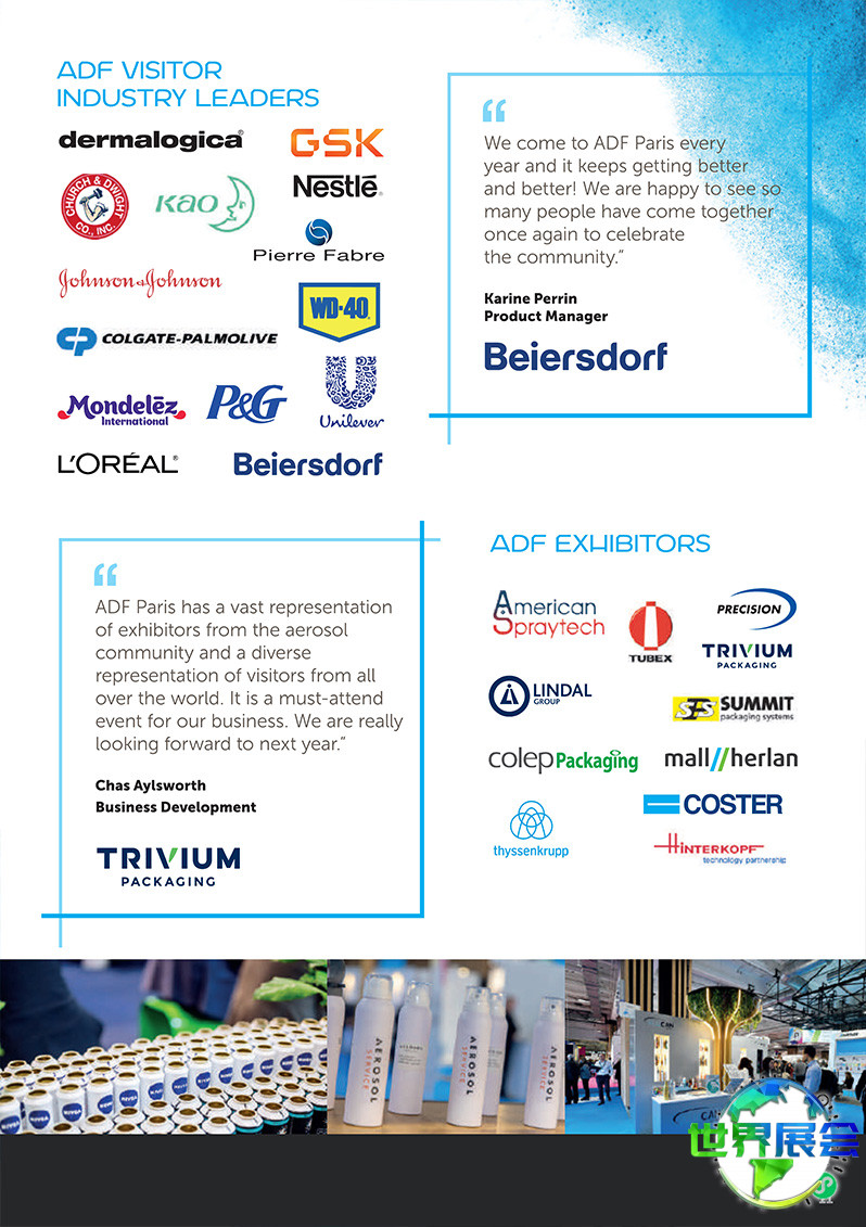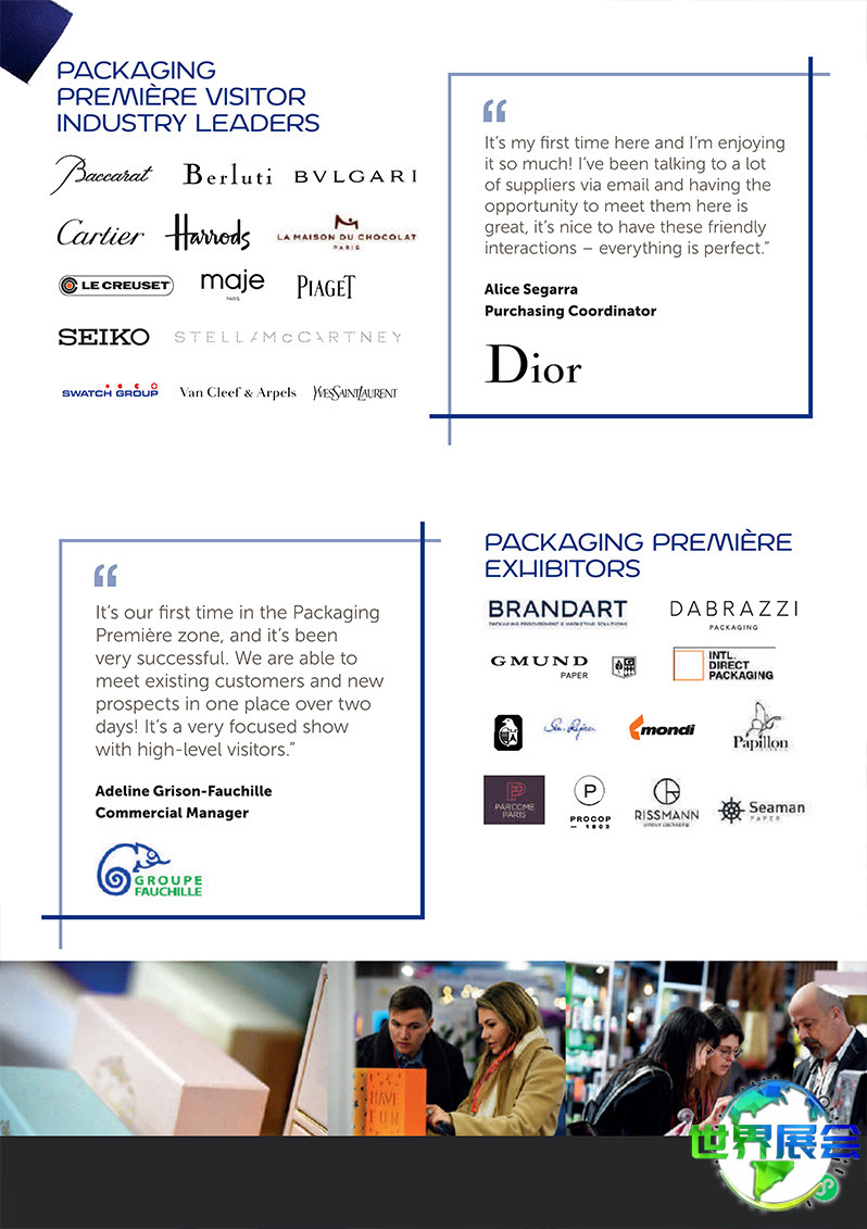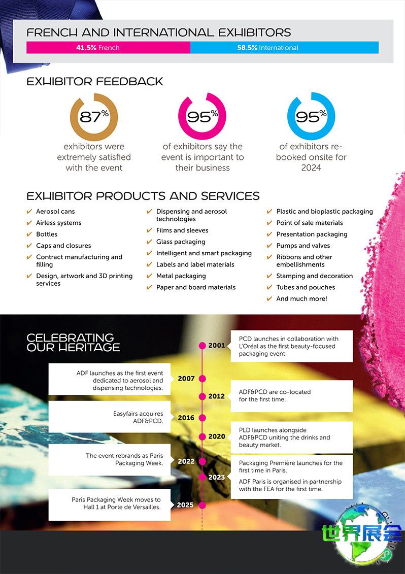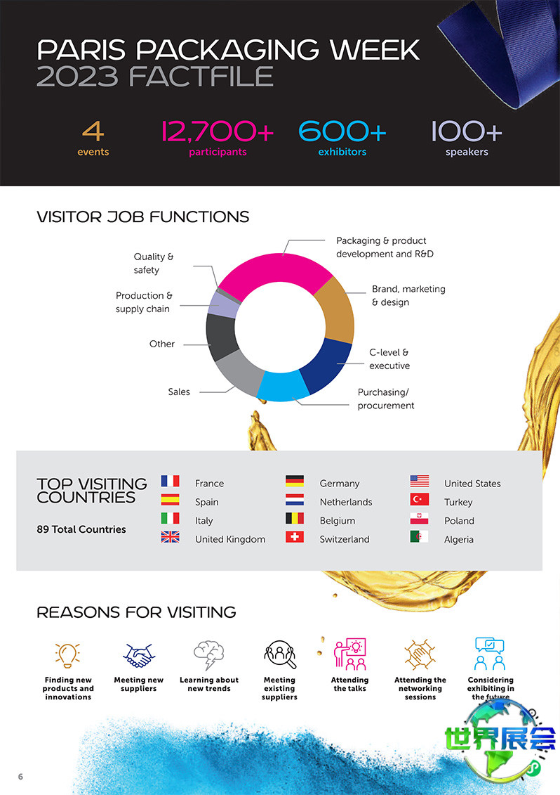 法国巴黎化妆品、香水包装及奢侈品包装展览会(Paris Packaging Week)上一届展会总面积达20000平方米,参展的395家企业分别来自英国、意大利、西班牙、美国、韩国、日本、新加坡、中国香港、迪拜、土耳其、中国等地,参观者数量达到19700人次。