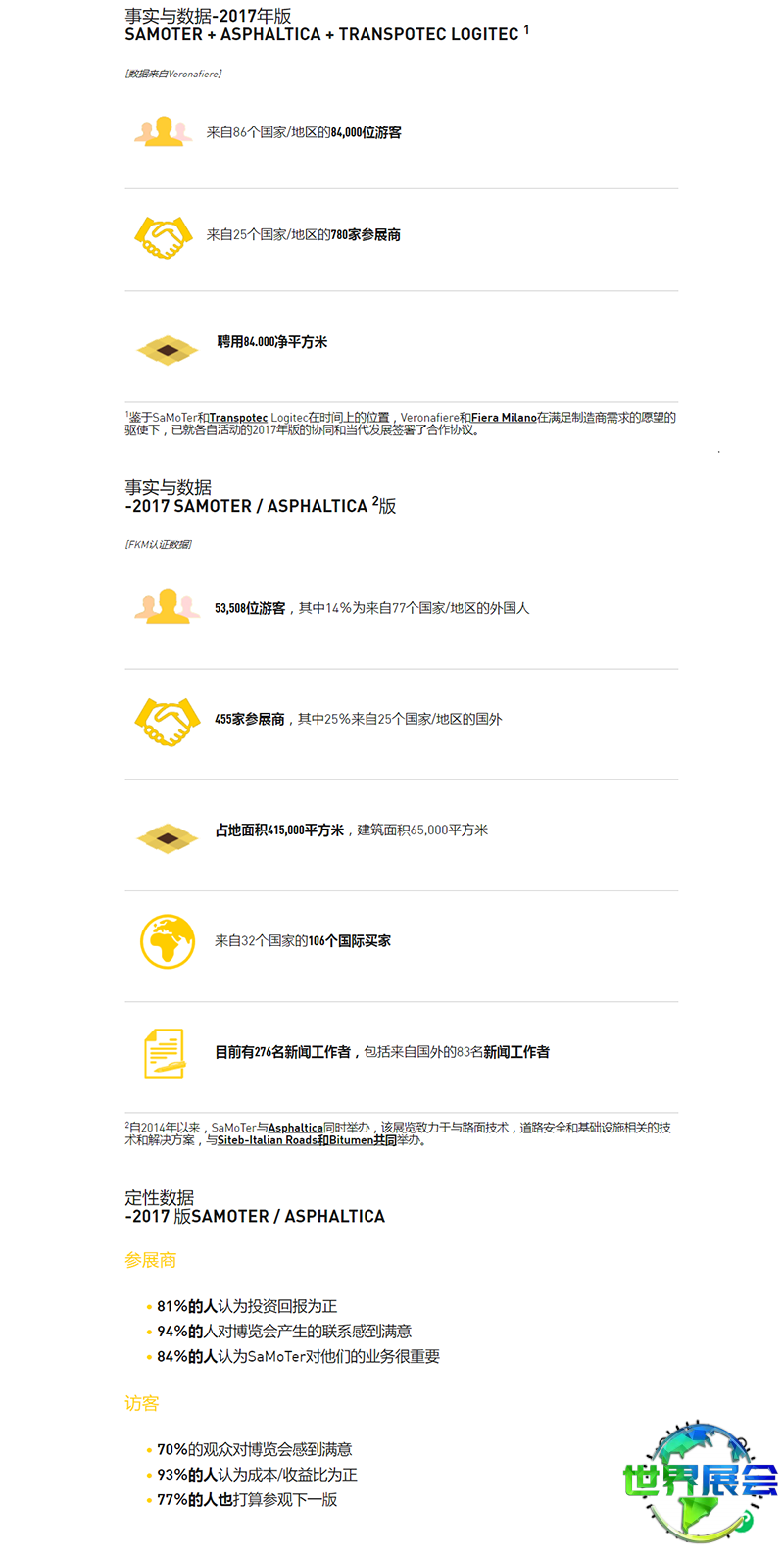 意大利维罗纳工程机械、高空作业机械展览会(SAMOTER)上一届展出总面积达118000平方米,吸引了909家参展企业,它们分别来自中国、德国、法国、英国、俄罗斯、捷克、西班牙、巴西、印度等国,参观者数量达到98048人。