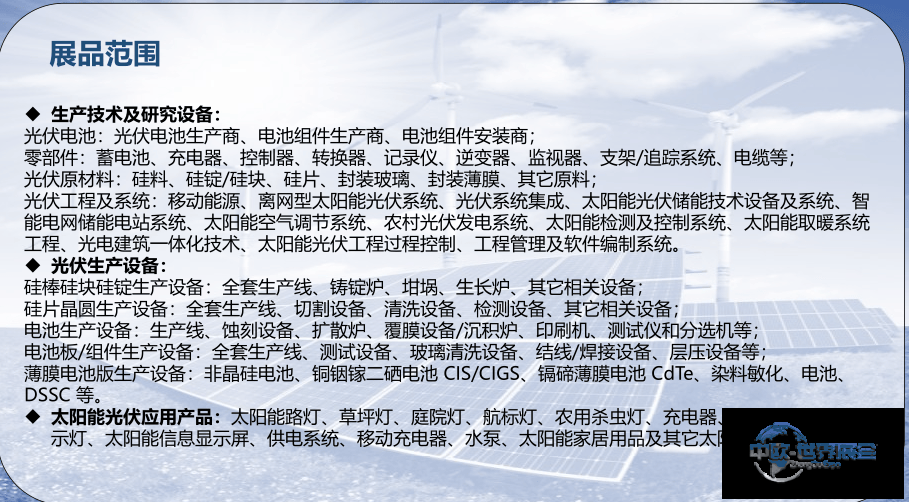 展会展品范围全面覆盖光伏与储能产业链的各个环节,从原材料供应、主辅材料、生产设备,到光伏组件、逆变器、支架、电池、储能系统,再到光伏工程及各类太阳能应用产品,几乎囊括了全产业链。参观者在此能够目睹行业最尖端的产品与技术,掌握产业发展的最新动向。