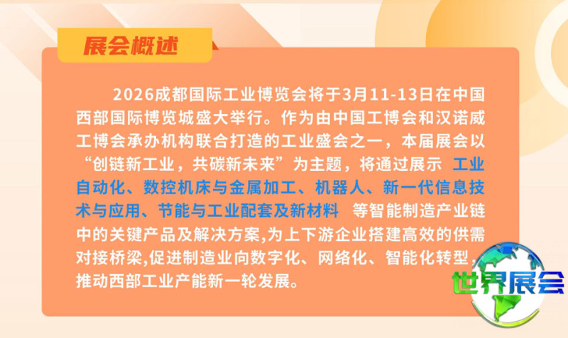 成都国际工业展览会(成都工博会,CDIIF)是中国中西部地区最具规模与影响力的工业行业盛会之一!本次博览会以“创新工业链,共享低碳新未来”为核心主题,云集全球九百多家顶尖工业科技企业与创新机构,重点展示智能制造、工业物联网、新型材料等先进领域,旨在为中国西部制造业的升级发展提供强大驱动力,规划展览总面积将突破八万平方米。