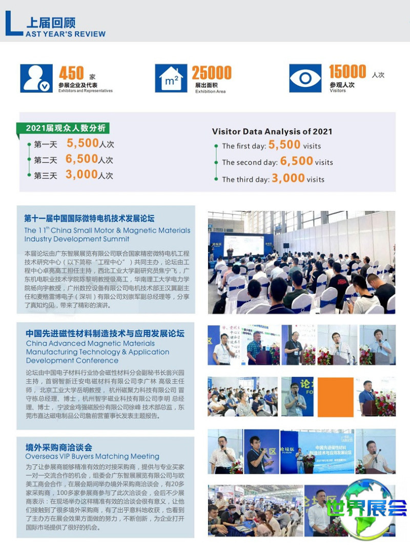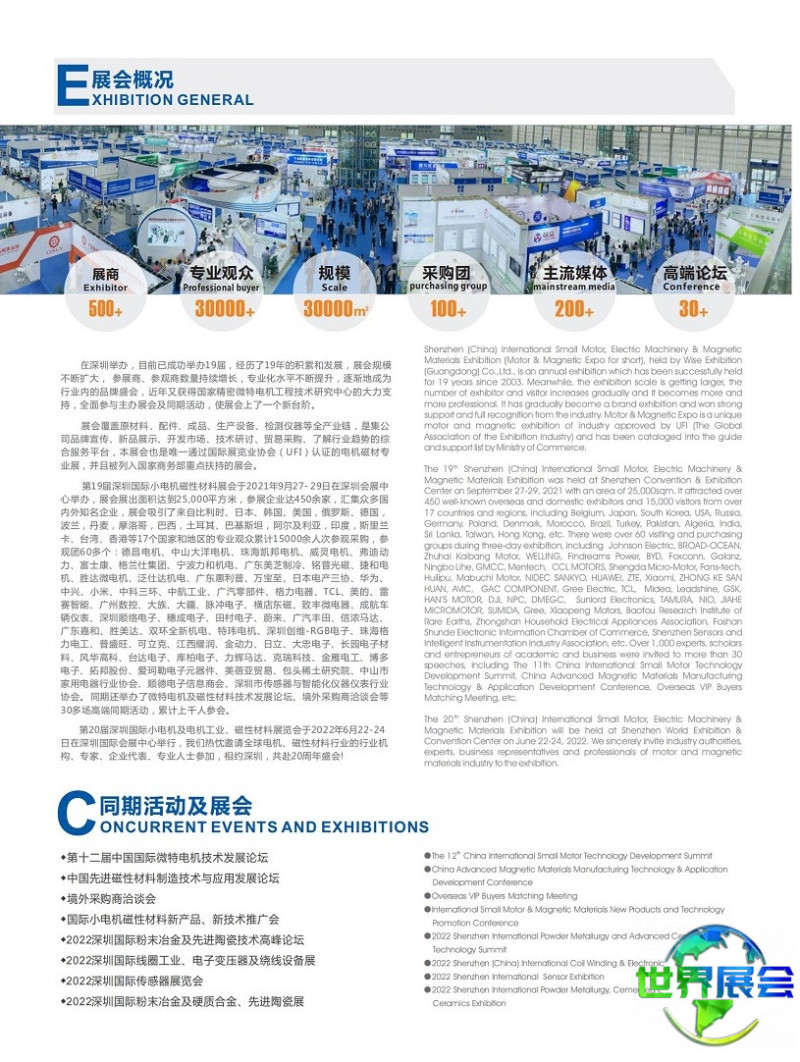深圳国际小电机及磁性材料展览会(Motor & Magnetic Expo)上一届展出总面积15000平方米,400家参展企业分别来自日本、韩国、印度、俄罗斯、美国、印尼、中国香港等国家和地区,参观人数达到20000人。