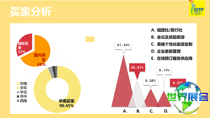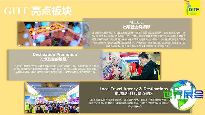 广州国际旅游博览会(GITF)是国内启动最早、延续时间最久的重量级国际旅游展会。自1993年创立至今,已发展成为海内外旅游业界高度聚焦,并覆盖出境游、入境游、会奖旅游等领域的国际性专业展览。