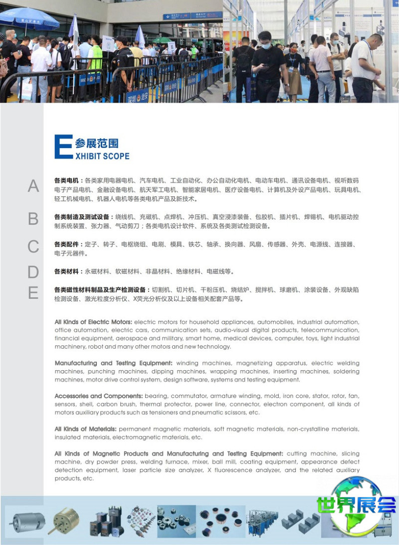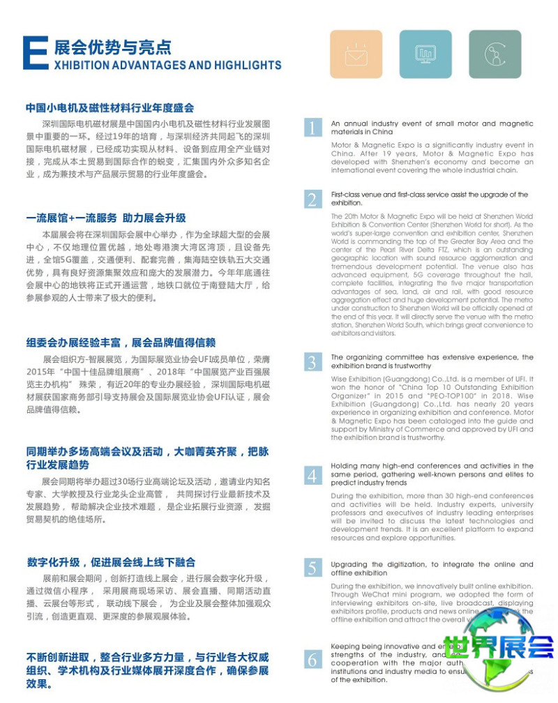深圳国际小电机及磁性材料展览会(Motor & Magnetic Expo)规模逐年扩展,参展企业与观众数量稳步上升,专业化程度持续提高,已逐步成长为该领域的标志性盛会。近年来更得到国家精密微特电机工程技术研究中心的鼎力支持,全面主导展会及同期活动筹办,推动展会品质迈上新台阶。该展会亦是目前唯一获得国际展览业协会(UFI)认证的电机与磁性材料专项展览,并被纳入国家商务部重点支持展会名录。