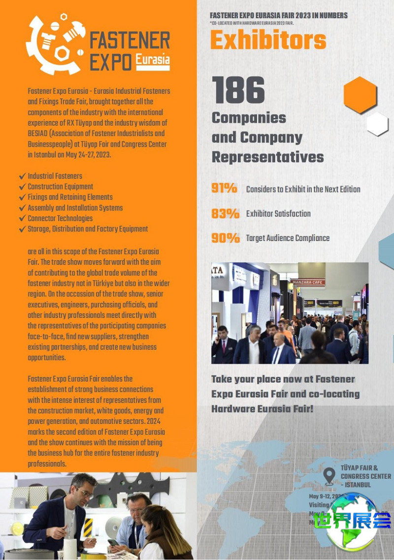 土耳其伊斯坦布尔五金及紧固件博览会(Fastener Expo Eurasia)是土耳其地区著名的紧固件专业展览。它将生产商、分销商、供应商及最终用户汇聚一堂,呈现一场独具特色的紧固件、固定技术与产品展示。该展会同时也作为一个贸易洽谈与交流的平台,为参与者提供关于未来技术及市场动向的重要参考。