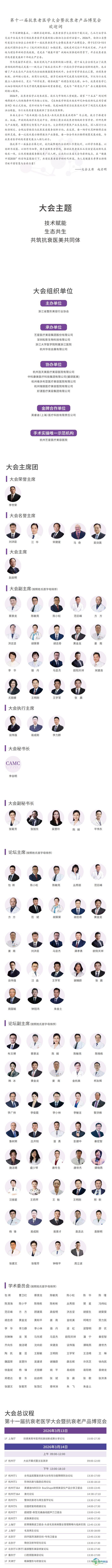 由浙江省整形美容行业协会主办的第十一届抗衰老医学大会及抗衰老产品博览会,定于3月13日至15日在杭州国际会议中心(杭州洲际酒店)正式召开。这不仅是对过去十年间技术发展、产业进步与观念创新的崇高献礼,更是在“健康中国”战略持续深化的时代背景下,宣告抗衰老医学迈入高质量全新发展阶段的郑重宣言。